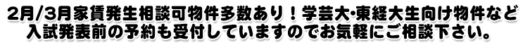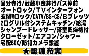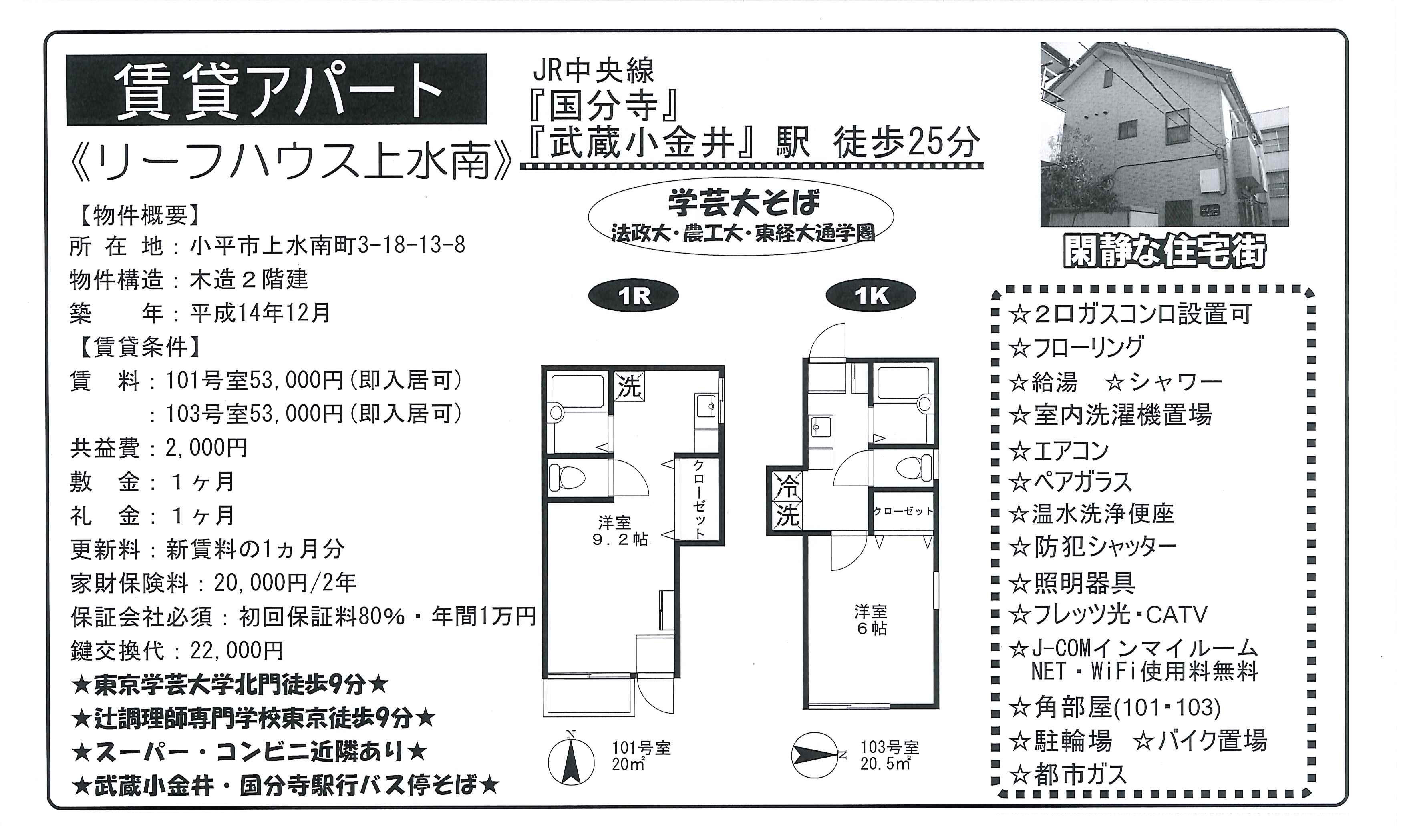 小平市上水南町2-27-8 (マルバーンカレッジ前です) 東京都小平市上水南町2-27-8 『文化学園大前』 国分寺駅/武蔵小金井駅/学芸大 周辺の物件多数! 是非お問合せ、御来店下さい 詳細・お問い合わせはお電話、メールでご連絡下さい 【国分寺駅】徒歩1分 シティタワー国分寺ザ・ツイン イースト ■ E2202号室 2LDK / 25.8万円 【国分寺駅】徒歩14分 エクストゥディオ桜上水 ■ 1K / 7.0万円 【武蔵小金井駅】徒歩6分 コーポM ■ 2LDK / 10.0万円 【国分寺駅】徒歩8分 ラ・カーナ ■ 107号室 / 1R / 4.2万円 リーフハウス貫井北町 ■ 武蔵小金井駅 歩10分 ■ 1K / 5.8万円 フォレストハウス ■ 武蔵小金井駅 歩20分 ■ 1K / 5.2万円 レーベン白井II ■ 武蔵小金井駅 歩19分 ■ 1R / 4.1万円 小桜ハイム ■ 武蔵小金井駅 歩24分 ■ 1DK / 4.0万円 リーフハウス上水南 ■ 武蔵小金井駅 歩25分 ■ 1R / 5.3万円 ■ 1K / 5.3万円 業者様へ